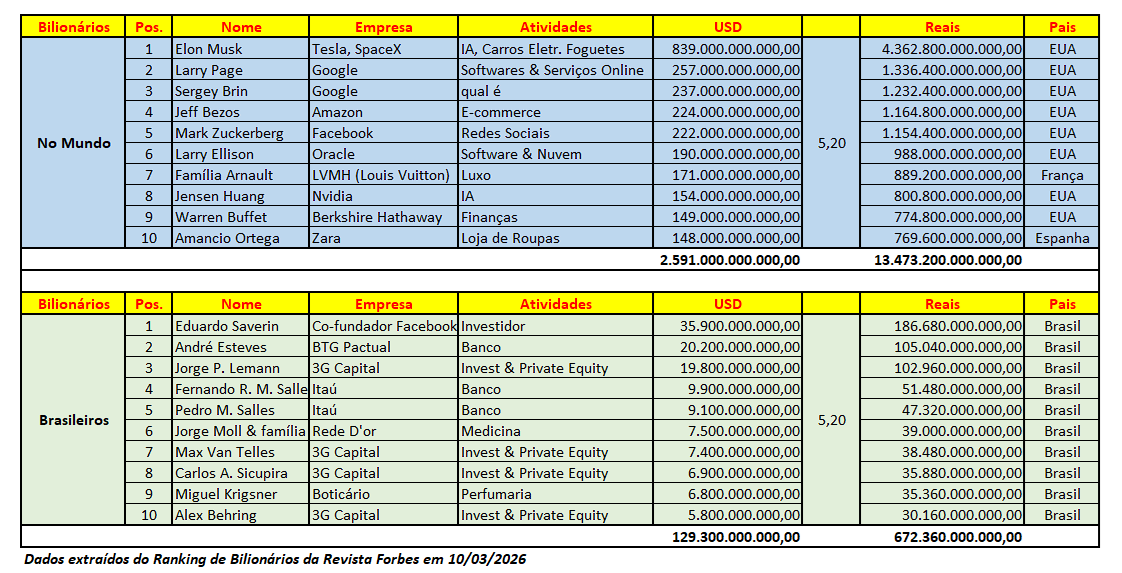 No dia internacional das mulheres deixamos aqui uma lista com as 10 mulheres mais ricas do Brasil sendo que na ordem de classificação por fortuna as 3 últimas estão empatadas. A publicação é de 28/08/2025. O Brasil tem uma população aproximada de mais de 210 milhões de brasileiros e com as mulheres representando mais da metade segundo o IBGE. Desse montante, segundo a revista Forbes, apenas 60 mulheres fazem parte do clube dos bilionários.