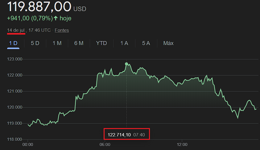 Faltou meros 0,10 centavos de dólar para o preço do BTC atingir a casa dos 119 mil dólares no dia 13 07 25. Sempre lembrando que horário UTC (Universal Time) é 3 horas mais adiantado do que o horário oficial de Brasília.