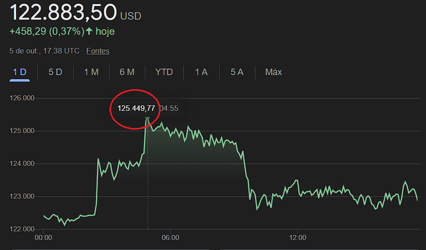 Hoje é 05 10 2025 e voltamos a registrar um novo recorde no preço do BTC em USD. A nova marca que registramos de quase 125.5 mil dólares supera a marca anterior na casa dos 124.2 mil dólares.