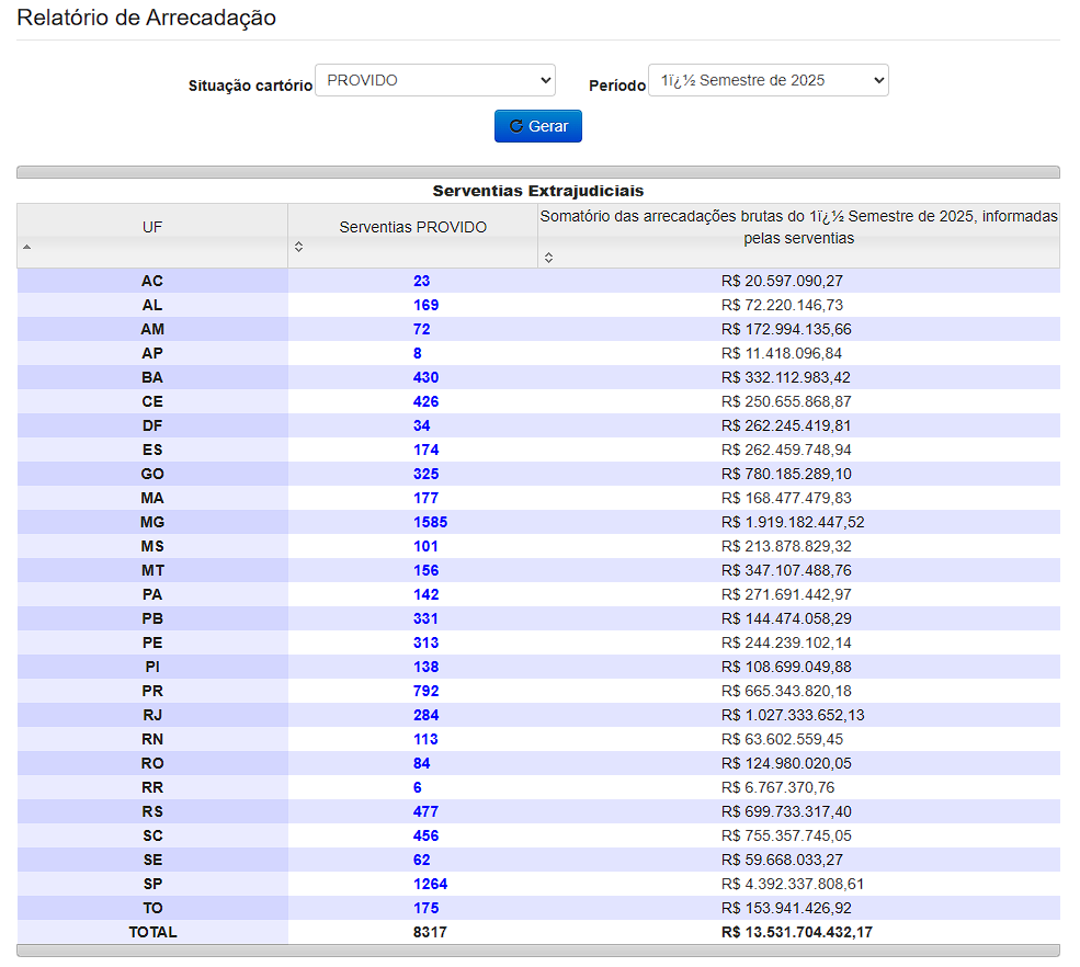 No site do CNJ (Conselho Nacional de Justiça) é possível consultar a arrecadação que é totalizada semestralmente, separado por estado. De acordo com este relatório o CNJ contabiliza um total de 8.317 serventias extrajudiciais (cartórios) que arrecadaram exatos R$ 13.531.704.432,17 durante o primeiro semestre de 2025. Link para o relatório segue abaixo: