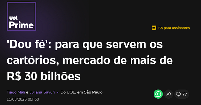 Fonte da imagem e link para a matéria completa (acesso exclusivo para assinantes): https://tab.uol.com.br/noticias/redacao/2025/08/11/dou-fe-para-que-servem-os-cartorios-mercado-de-mais-de-r-30-bilhoes.htm