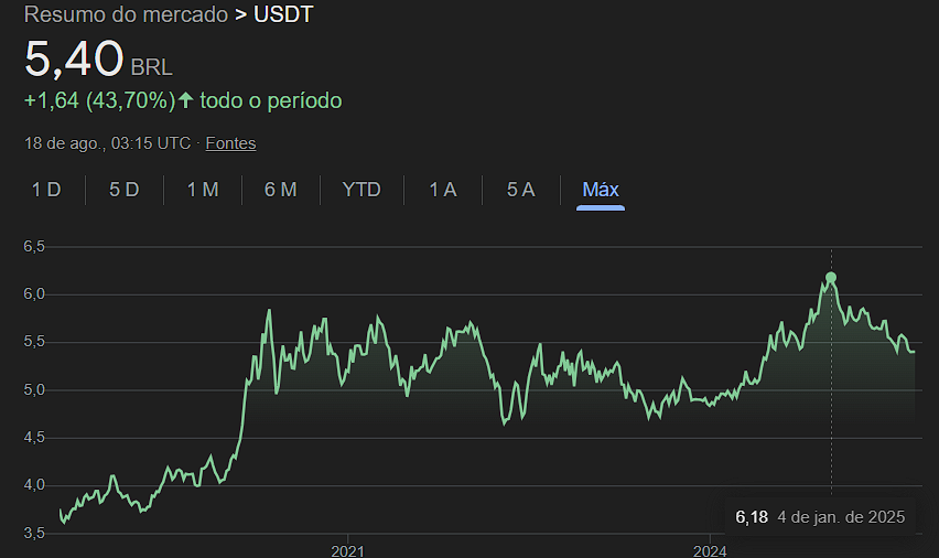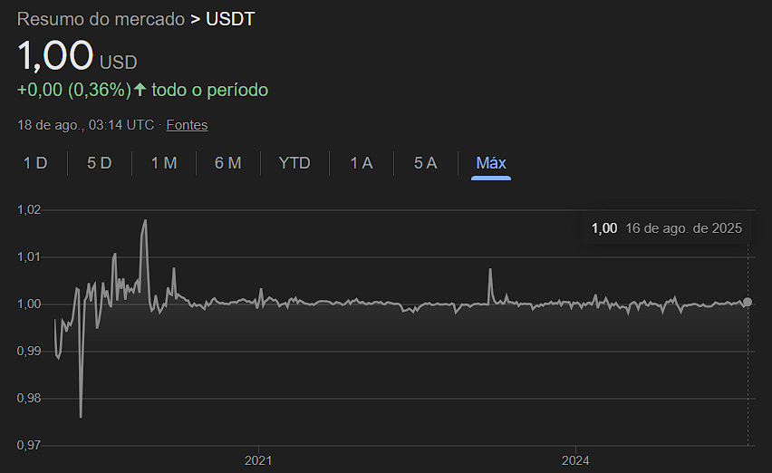 A questão da paridade que é propagada inclusive no meio “especializado” como fator de confiança tem que ser olhada sob a ótica do ativo pareado, no caso do USDT a estabilidade do preço deve ser conferida em dólares. Ao longo do tempo, em dólar, um USDT oscilou mais ou menos entre USD 0,98 cents e USD 1,01. Em reais existe a questão cambial que acaba fazendo com que o preço acabe oscilando de forma mais elástica. Ao longo do tempo, em reais, um USDT oscilou mais ou menos entre R$ 3,65 e R$ 6,18. Comparando os mesmos períodos mostrados no gráfico a variação do Tether não chegou a 0,40% enquanto em reais houve uma valorização de mais de 43%. Essa variação ocorre por causa da questão cambial entre dólar e real. Vale a pena ficar atento para esse tipo de detalhe se eventualmente houver interesse na compra desse tipo de criptoativo. De qualquer forma a compra de USDT transforma reais num criptoativo muito mais estável que minimiza riscos de uma eventual oscilação negativa numa hora indesejada, quando eventualmente houver necessidade de vende-los.