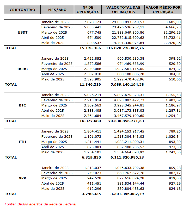 Separamos os cinco criptoativos mais negociados oficialmente no período de janeiro a maio de 2025, cujos dados foram reportados pelas corretoras/exchanges para a Receita Federal seguindo determinação da Instrução Normativa RFB n° 1.888, de 3 de janeiro de 2019, conforme quadro abaixo: